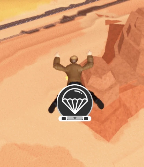 Parachuting is a feature that allows players to get down from high areas without dealing with fall damage. Parachutes can be deployed if the player is skydiving and presses the jump key (Spacebar for PC, jump button for mobile, etc). Falling speed is reduced by seventy-percent with the parachute when compared to falling without one. Players can use weapons and items while parachuting. |