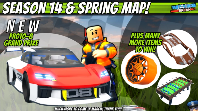 New prizes: Roblox-R and Bloxxer Launcher Spoilers, Beloved Wardrobe and Spawn Rug Furniture, R2008 Tires, Speed Coil and Truss Rims, Bloxxer Drift, and Stud Skin.