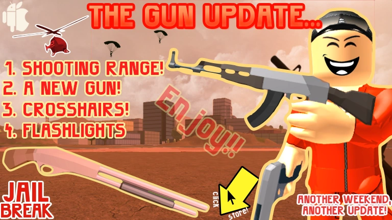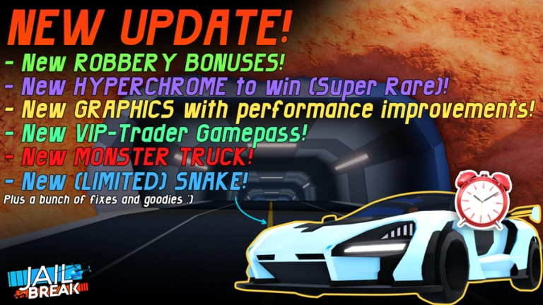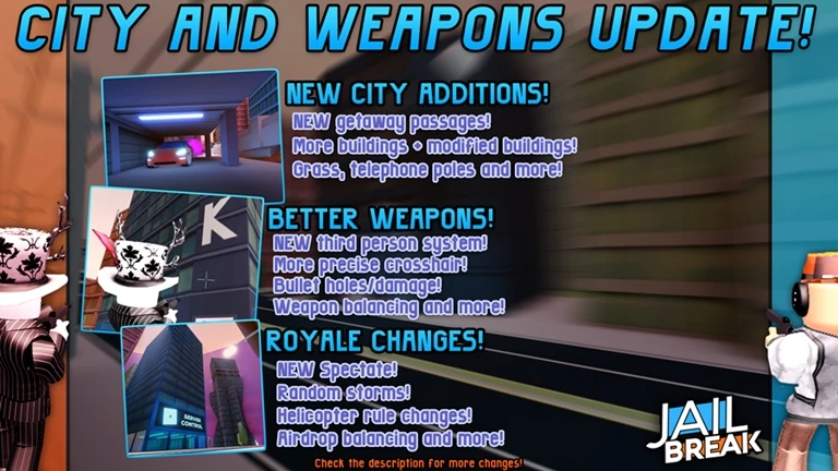 Historically, Jailbreak was updated weekly in its BETA stage, with updates releasing at around 12 AM PST (UTC-8) (3 AM EST) (2 AM CST) on Fridays or Saturdays. Badimo had then switched to a more spaced-out schedule, ranging from monthly to weekly updates as of the official release date.