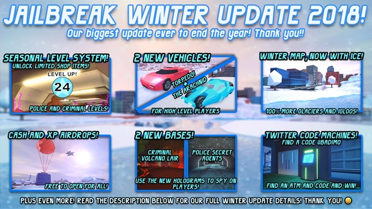 Main Updates are updates which are announced on Badimo's or asimo3089's Twitter page. Main updates are usually released monthly on the first, second or last weekends of a month. Main updates normally include new vehicles, features, revamps, locations, items and/or robberies, along with some bug fixes and/or minor changes. Main updates can range from being really big, adding 5+ items to being small and adding 1 item.